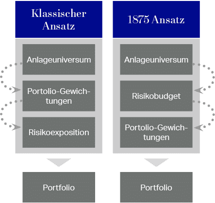 Der Ansatz von 1875 FINANCE fokussiert sich auf das Risikobudget. Jedes neue Investment wird einer Risikoabwägung unterzogen, was dann die Bestimmung der Portfoliogewichte erlaubt.